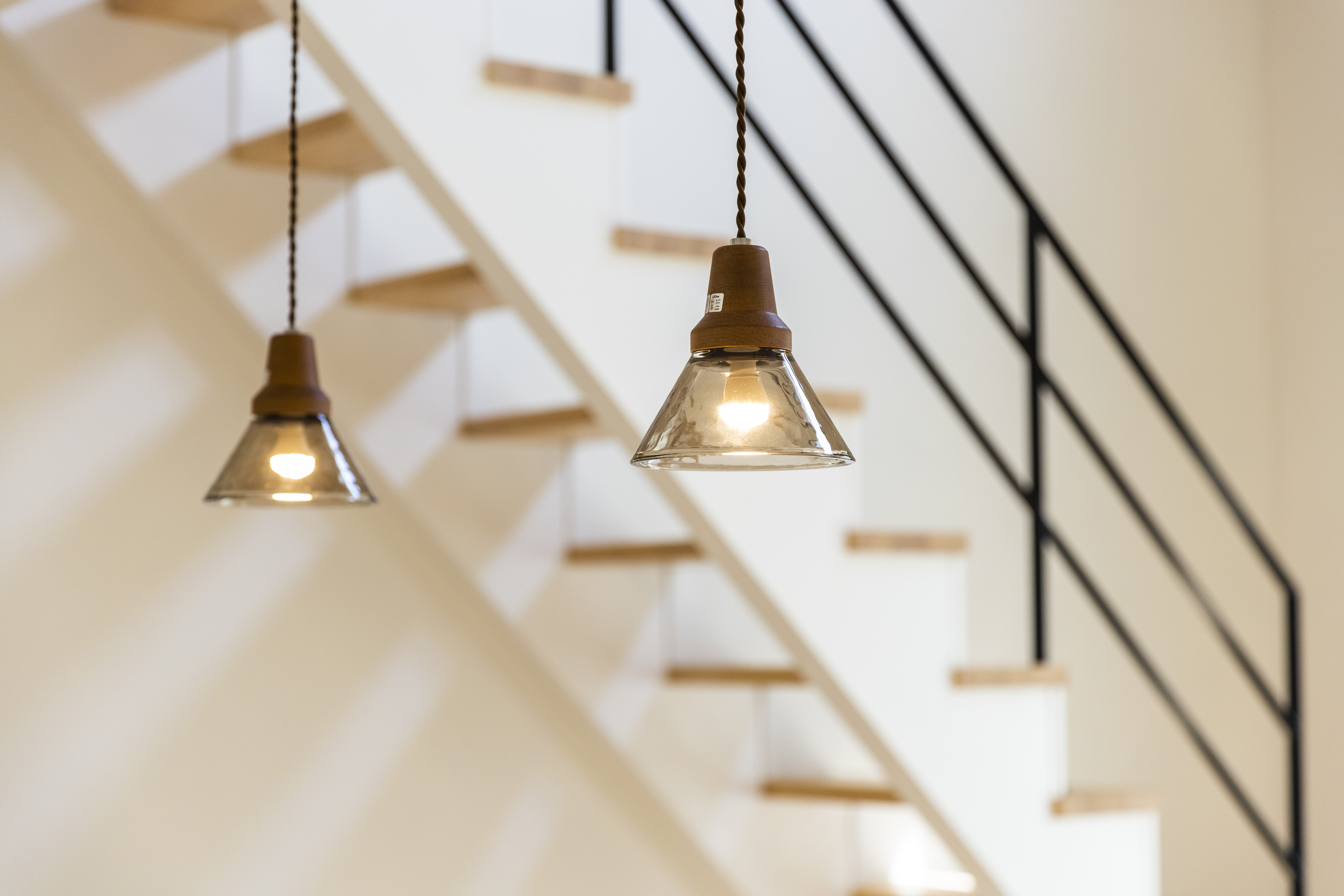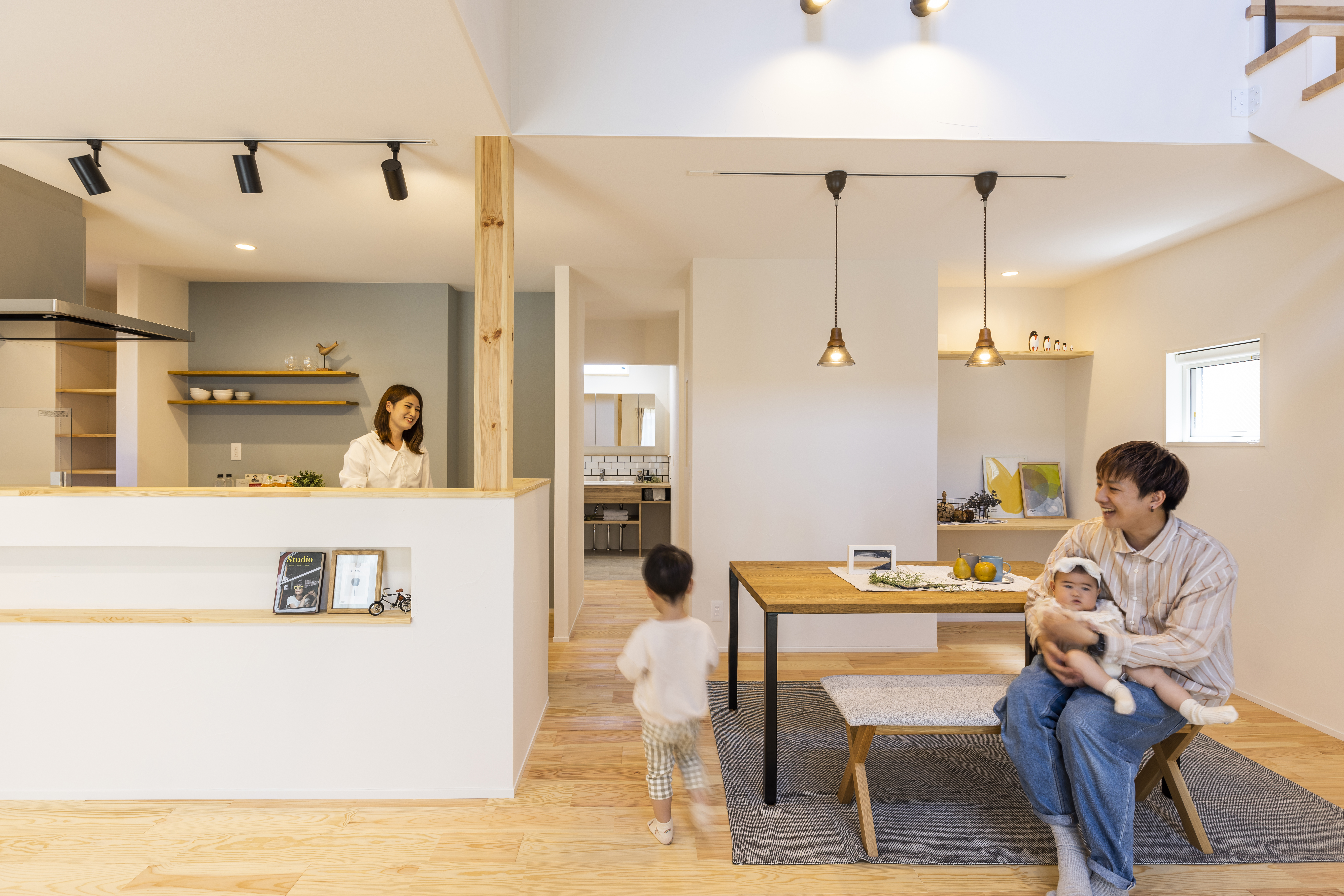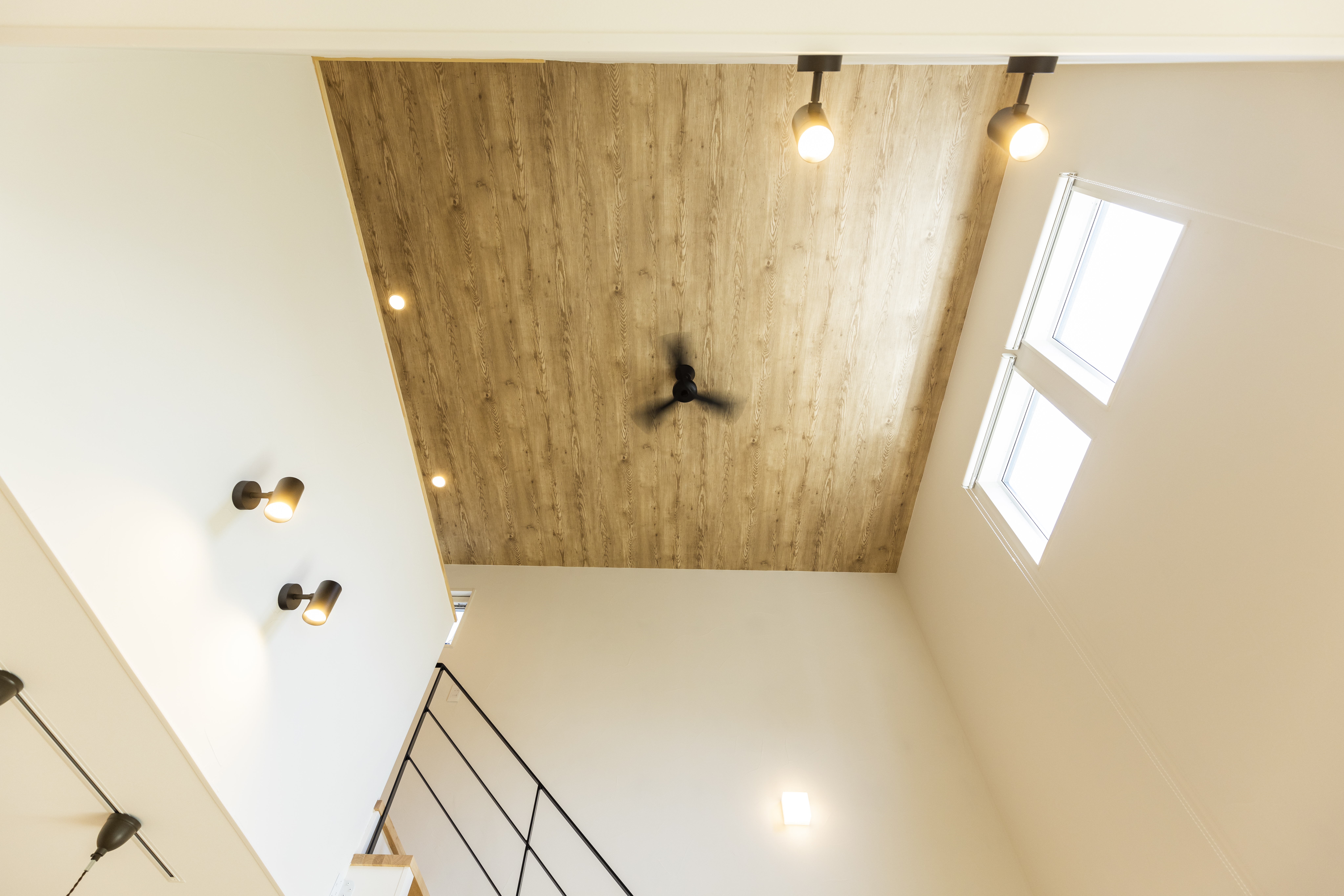隣家が近く、採光が懸念されがちな分譲地での計画ですが、吹き抜け窓を計画し解放感抜群のLDK空間になっています。