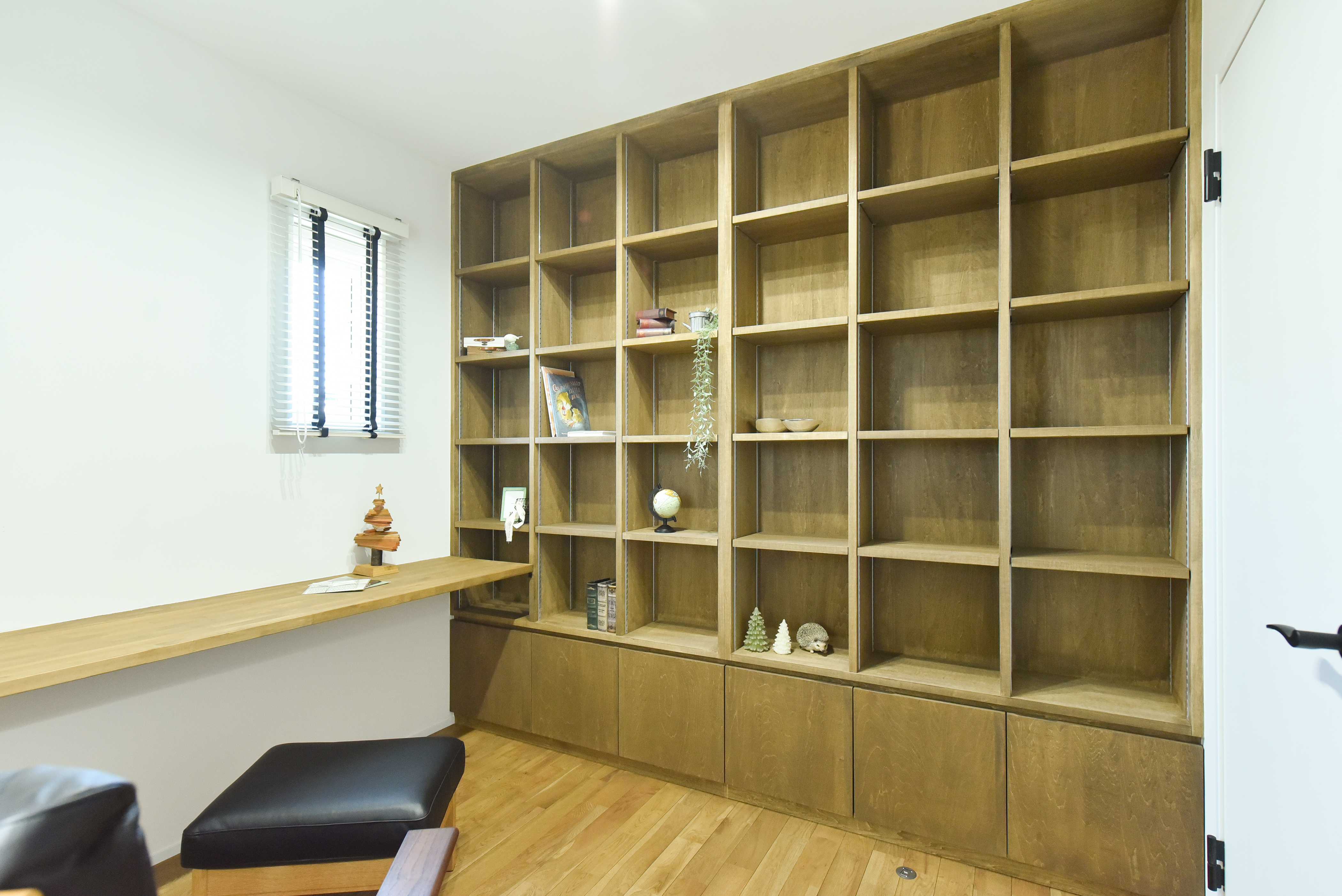キッズスペース×読書スペースになるピットフロア、スタディコーナー×壁面収納を備えたスキップフロアのある実用的設計のおうちです。