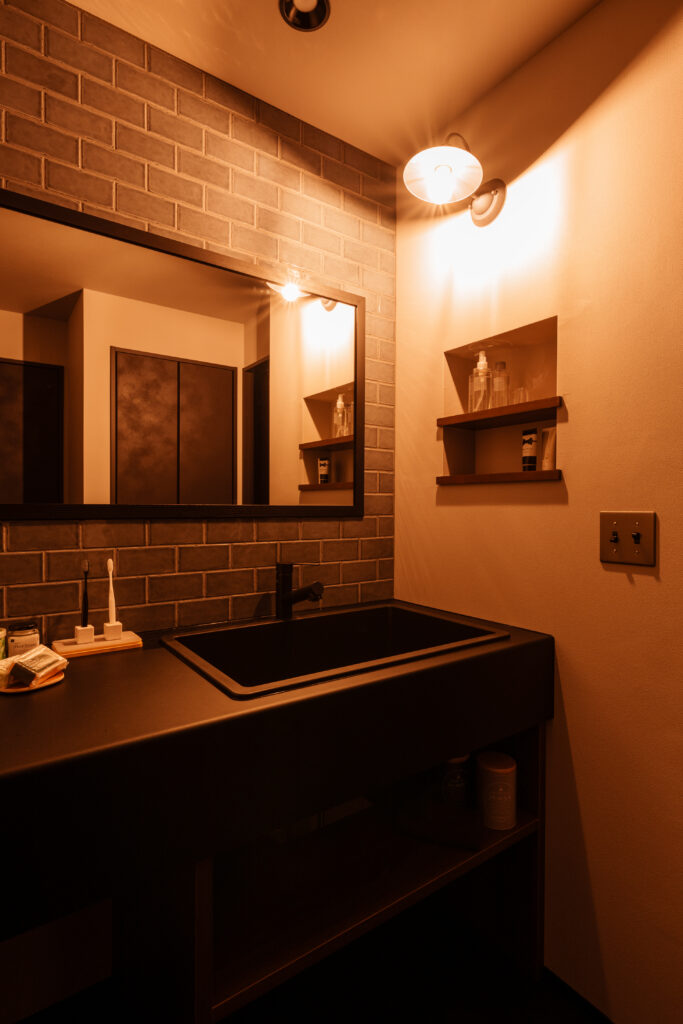 マットブラックを採用し、造作洗面台もシックにまとめた