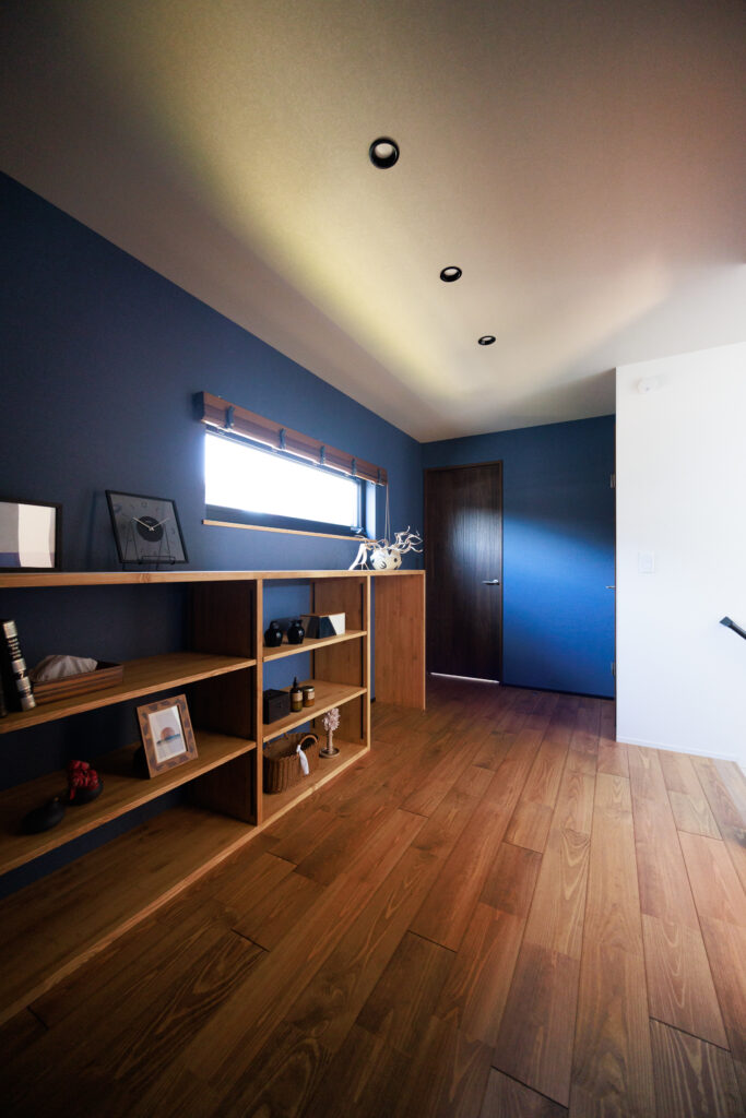 青い壁紙を使った2階廊下は見せる収納でおしゃれに