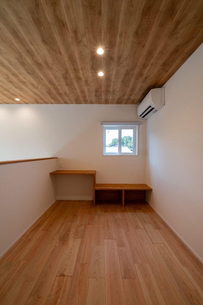 漆喰壁×無垢床の自然素材と木の温もりを引き立てるナチュラルな空気感が調和し、