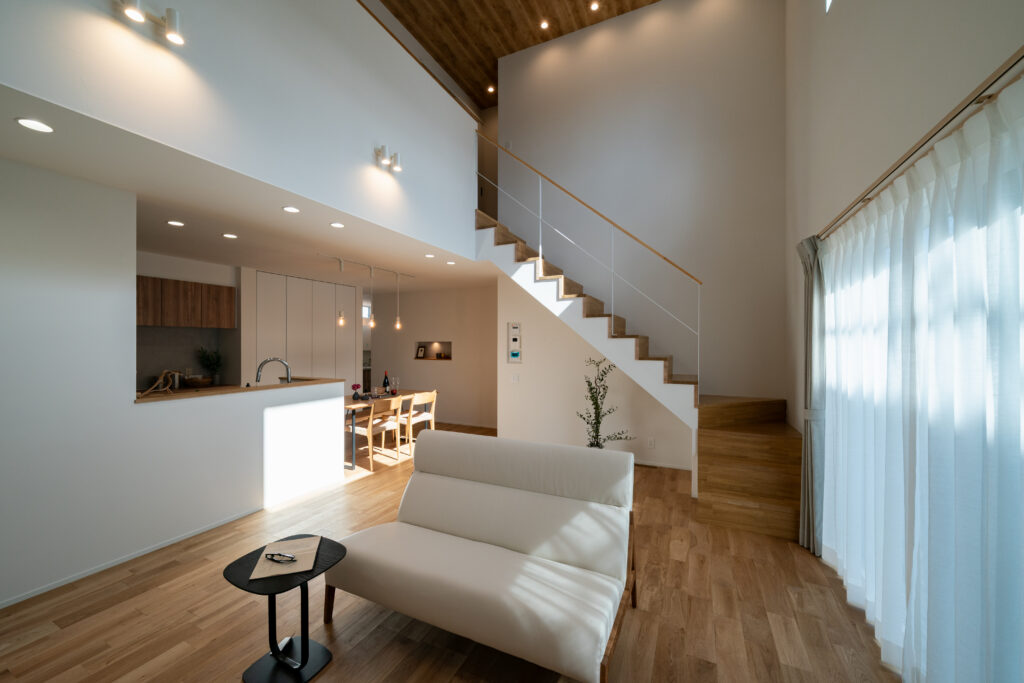 自然光と計算された照明配置が生み出す、開放感あふれる吹き抜けリビング