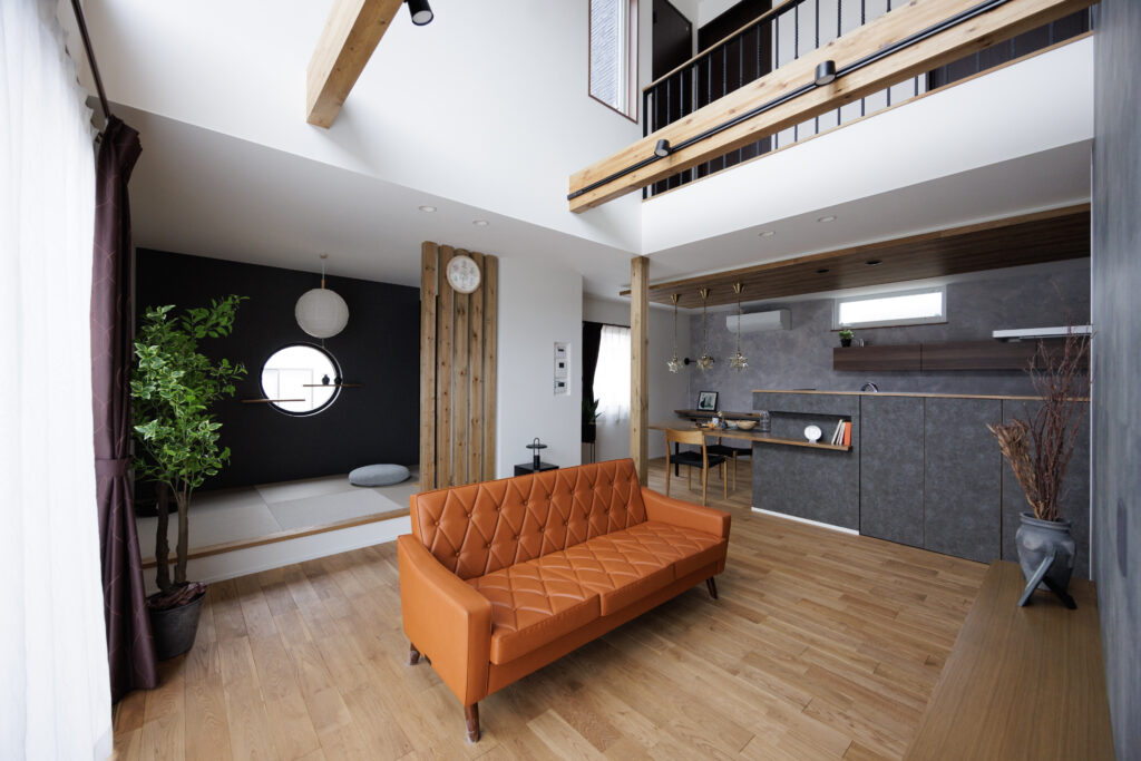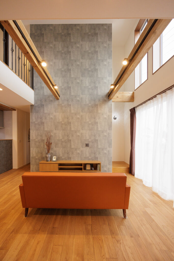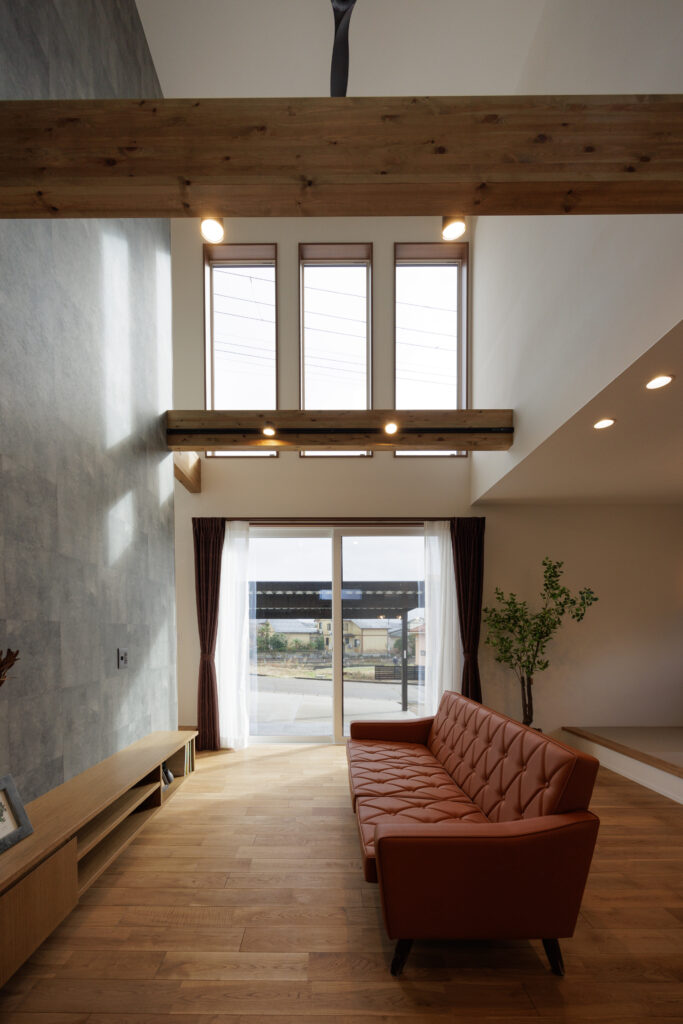 吹き抜けリビングは梁を出し、将来はハンモックをかけられる設計に。大きな掃き出し窓はタイルテラスと繋がり、リビングがより開放的な空間になった。