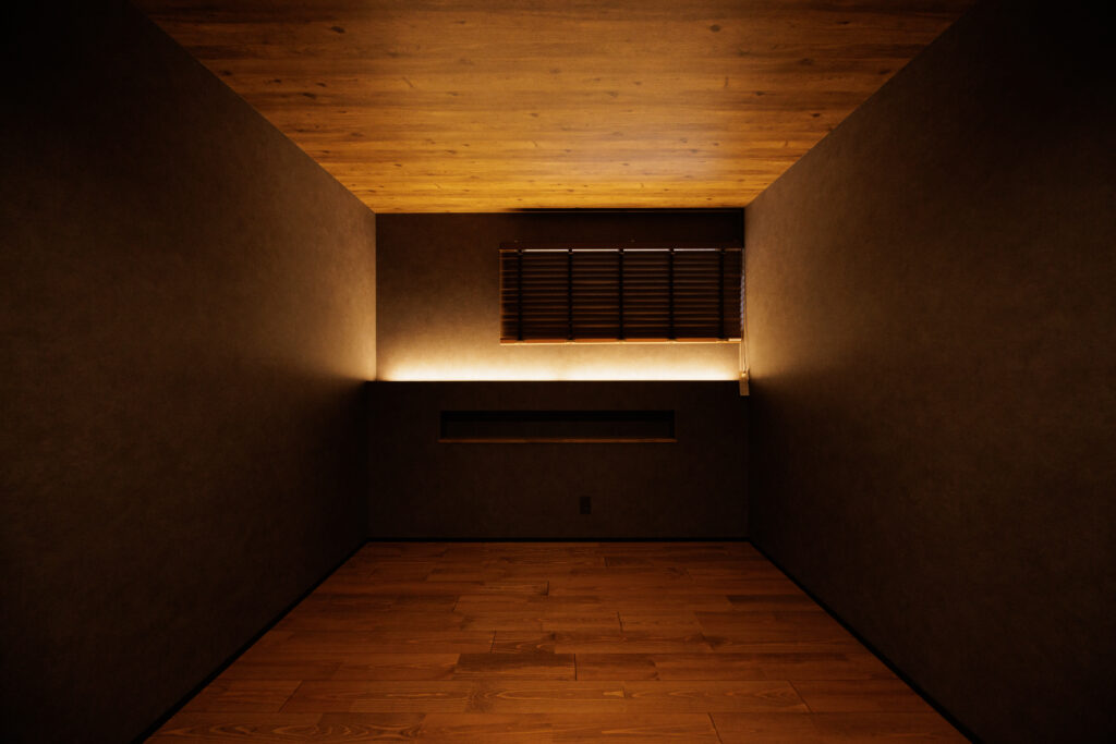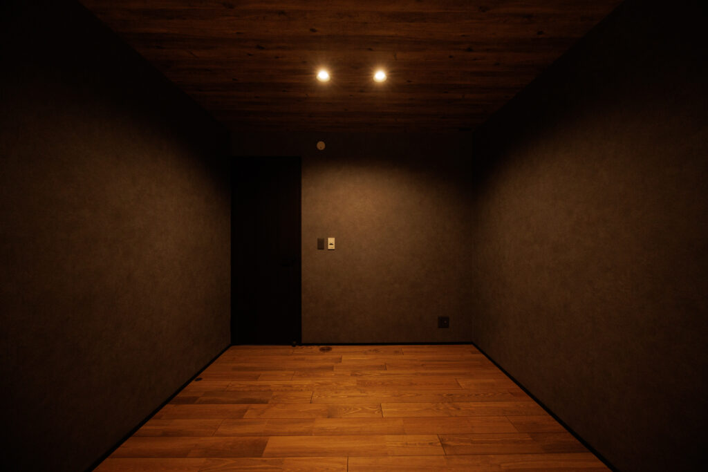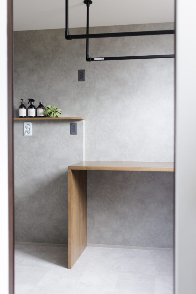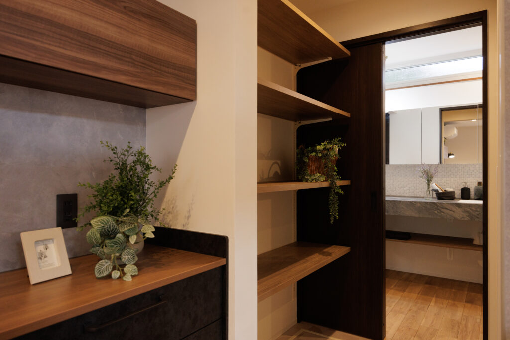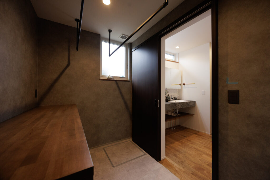 洗面台は家族が横に並んでも広々使え、掃除もしやすいフラットシンクの造作洗面台を採用し、寝室は雰囲気をガラッと変えた黒×木目のシックでかっこいい印象に。