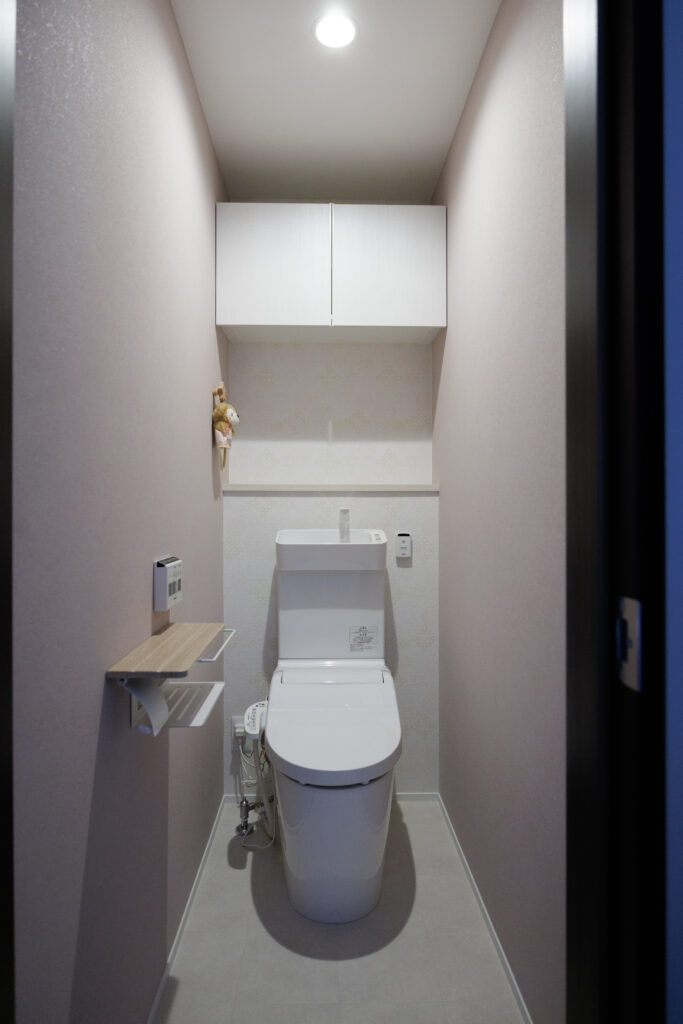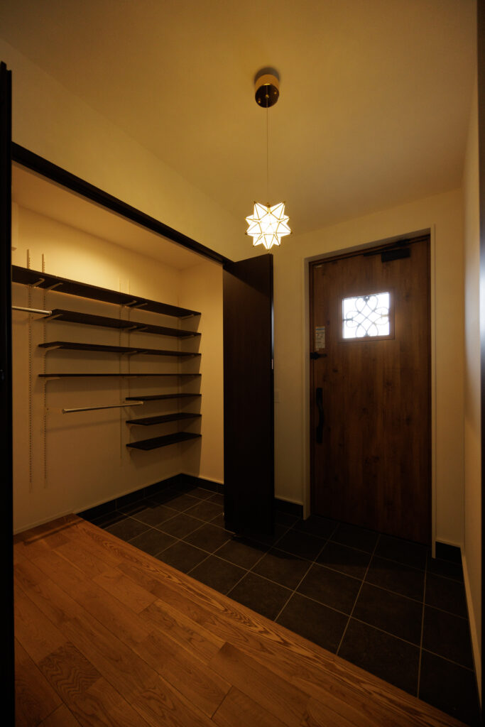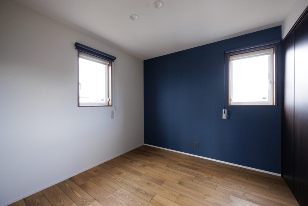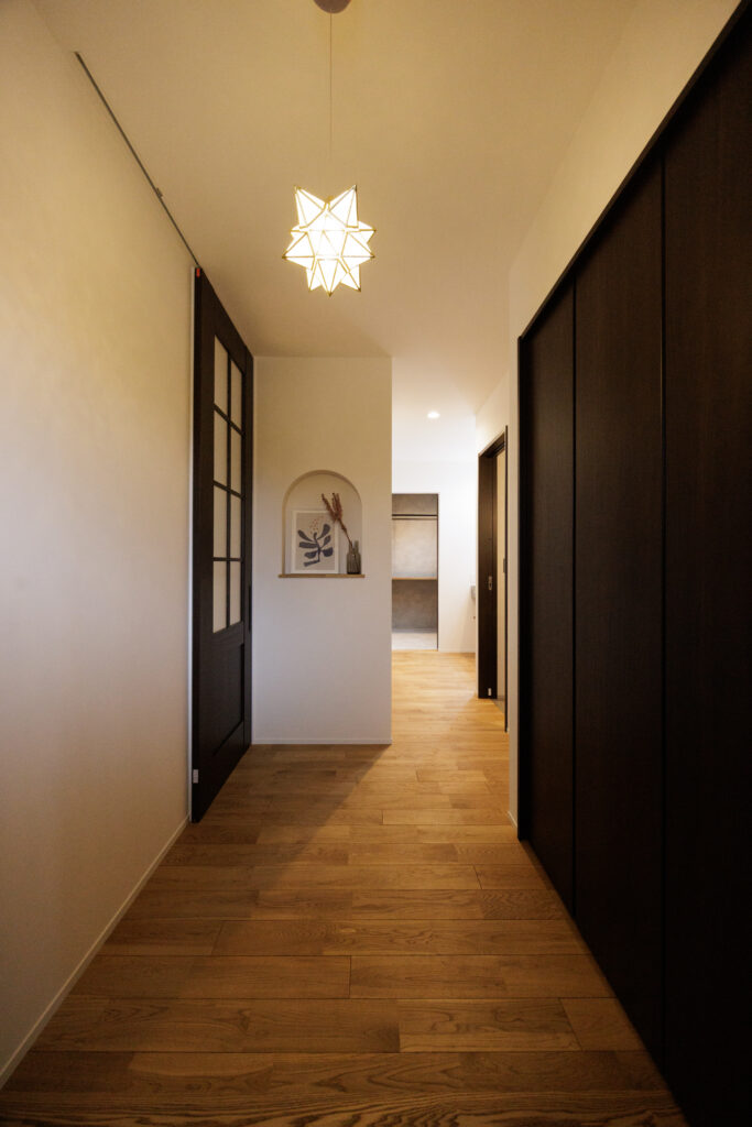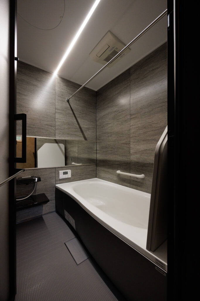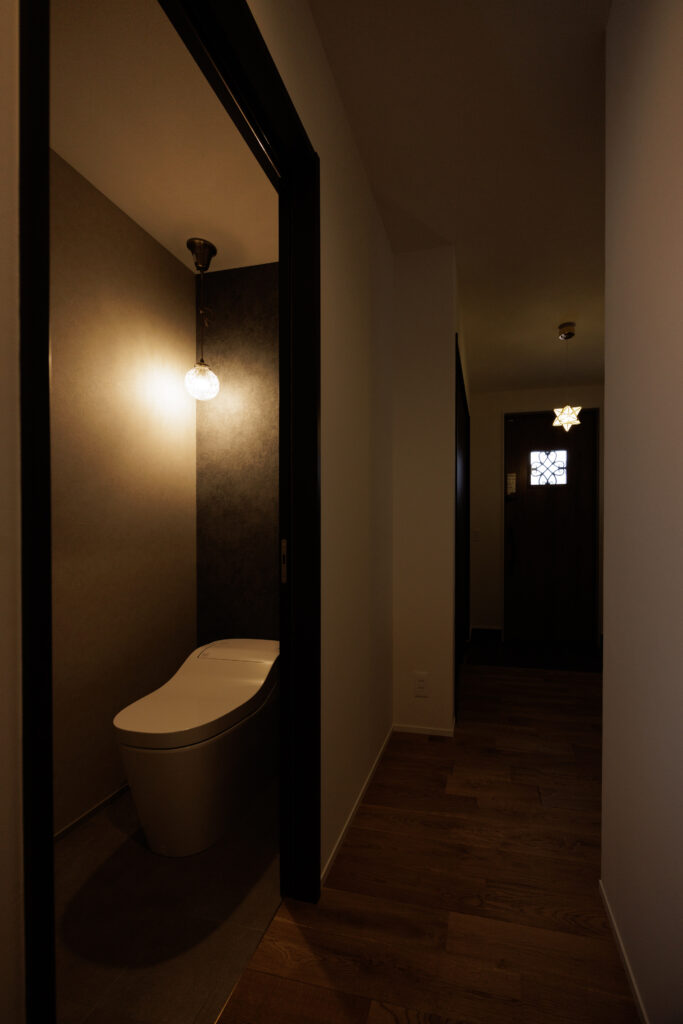 洗面台は家族が横に並んでも広々使え、掃除もしやすいフラットシンクの造作洗面台を採用し、寝室は雰囲気をガラッと変えた黒×木目のシックでかっこいい印象に。