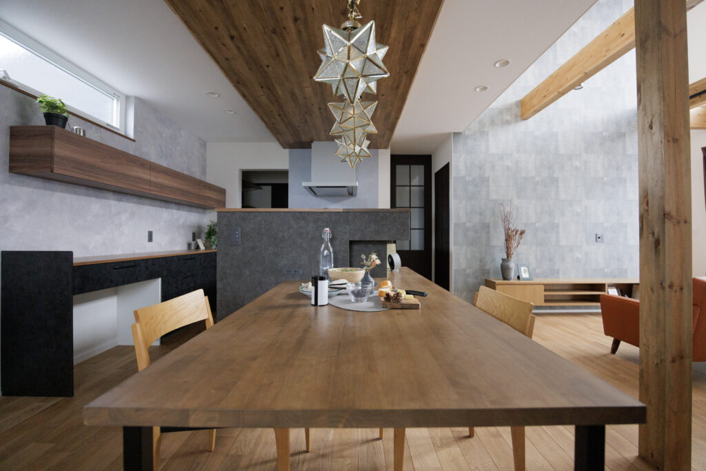 家中を彩る造作家具も圧巻。ダイニングテーブル、TVボード、趣味のコレクション専用棚などお施主様こだわりの空間に仕上がった。